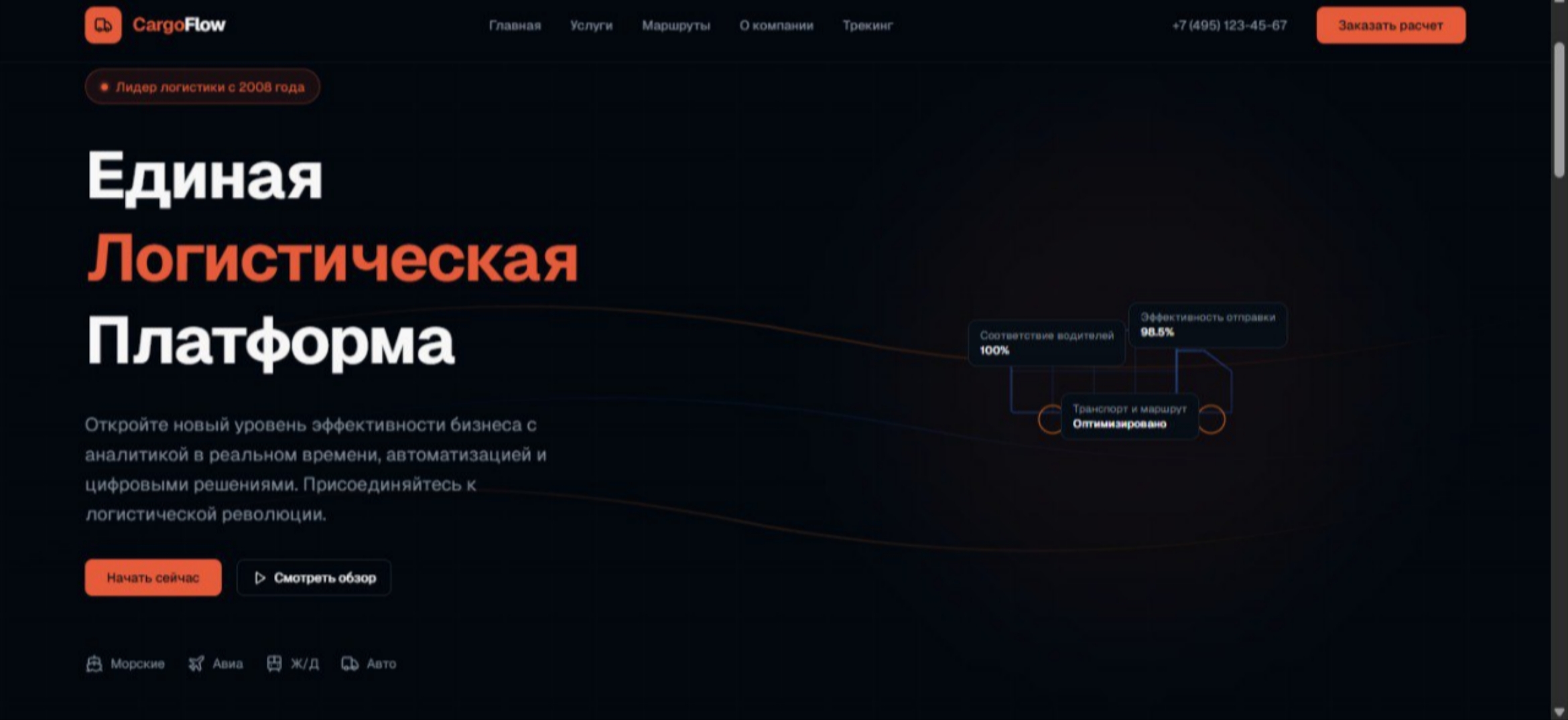 Демо-сайт логистической компании с описанием услуг перевозки и преимуществами.